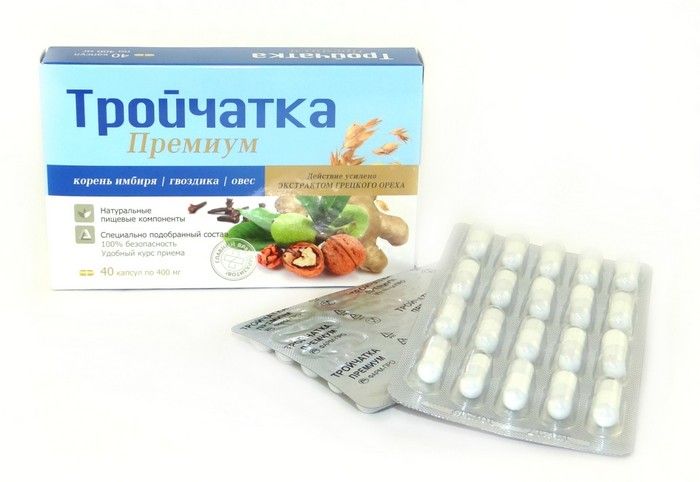 БАД Тройчатка Премиум рекомендован в качестве общеукрепляющего средства, улучшающего функциональное состояние желудочно-кишечного тракта. Может быть использована как средство в лечении больных с лямблиозом, аскаридозом и энтеробиозом.